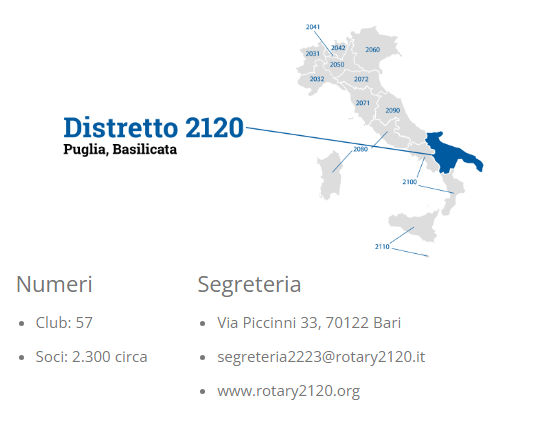 Il Distretto 2120 è costituito oggi dai Club pugliesi e lucani e unisce oggi oltre 2.300 soci per 57 club impegnati all’interno ed all’esterno dei relativi territori di pertinenza.
